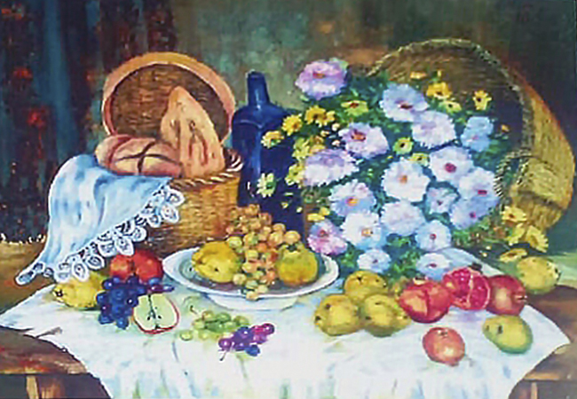Telvi de Miguel por su parte, participa con una de sus completas obras, un detallista Bodegón, envuelto de realismo con un original aroma a flores y pan. Una composición que nos traslada al mundo rural, centrándose en el salón de una tranquila casa de pueblo, bajo un fondo de antiguas cortinas y sobre una mesa de robusta madera. Frutas verdes y maduras se reunen sobre un satinado mantel blanco, el cuál ilumina la armónica mezcla de color, que da vida a esta obra.